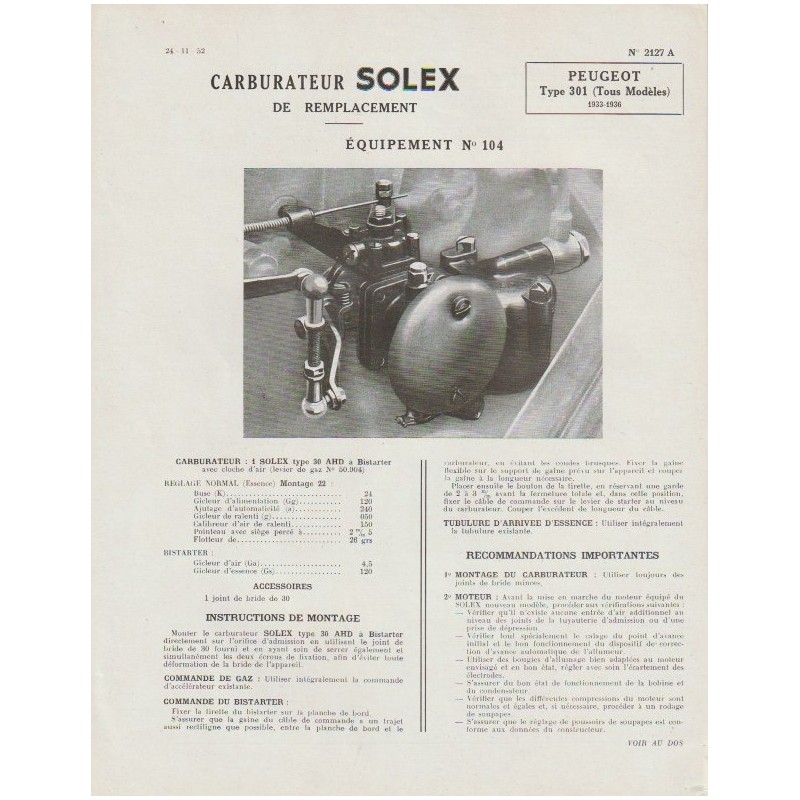 - Fiche Carburateur Solex Type 26 AHD 2 Pages Bon Etat