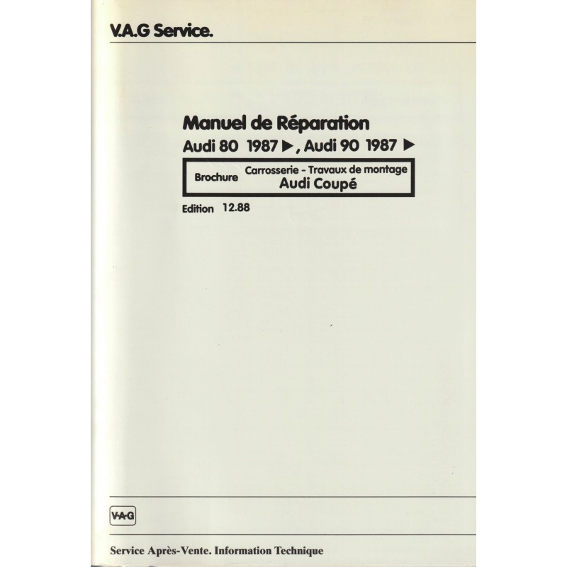 - Manuel de Reparation Equipement Electrique Audi 80 & Audi 90 1987 > ...... - Instrumentation de Bord - Ordinateur de Bord - Essuie Glace - Feux & Phares - Lampes & Plafonnier - Cablages 160 Pages Edition Janvier 1989 Reproduction