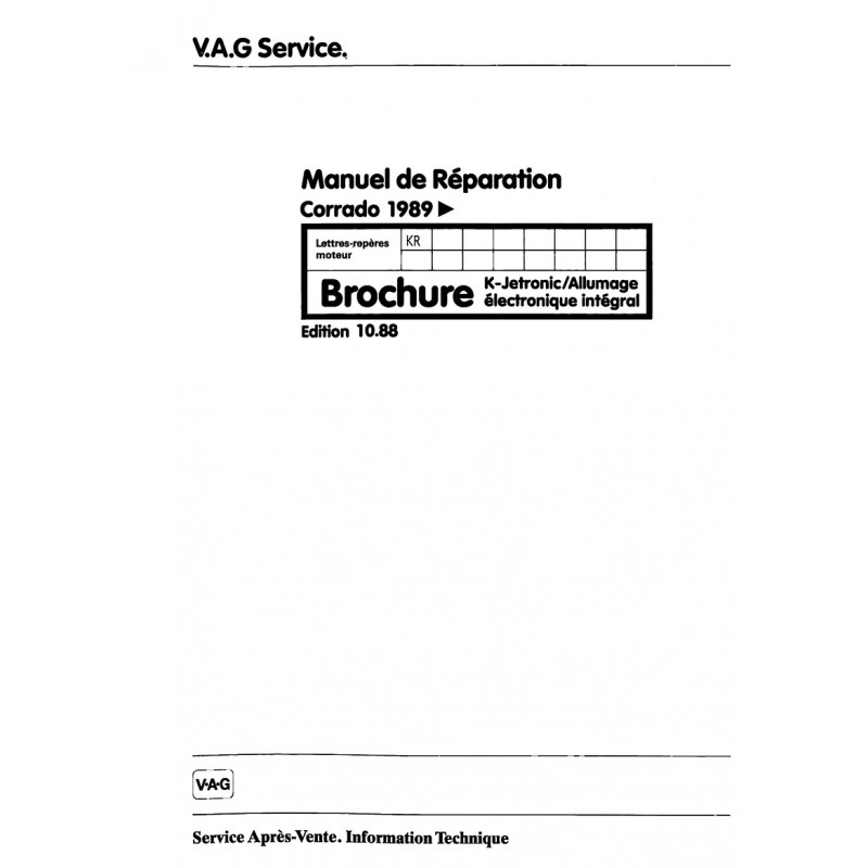 - Manuel de Reparation Corrado 1989 > ...... Carrosserie - Face AV - Capot & Hayon - Porte AV - Toit Ouvrant - Pare Chocs - Glaces - Equipement Exterieur - Equipement Interieur - Revetements - Sieges 80 Pages Edition Octobre 1988 Original Bon Etat