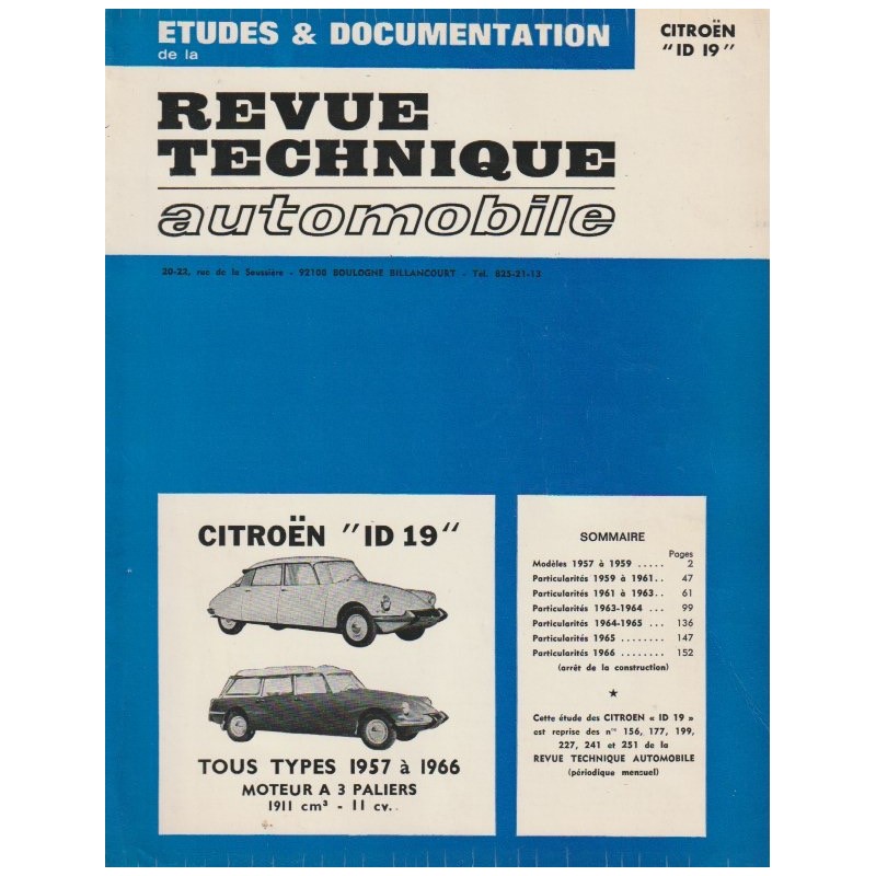 - RTA n° 250 Edition Fevrier 1967 Mecanique & Electricité Citroen ID 19 B Moteur 1985 cm3 ( 5 Paliers ) 80 Pages Bon Etat Couverture Légèrement Tachée & Usée !!