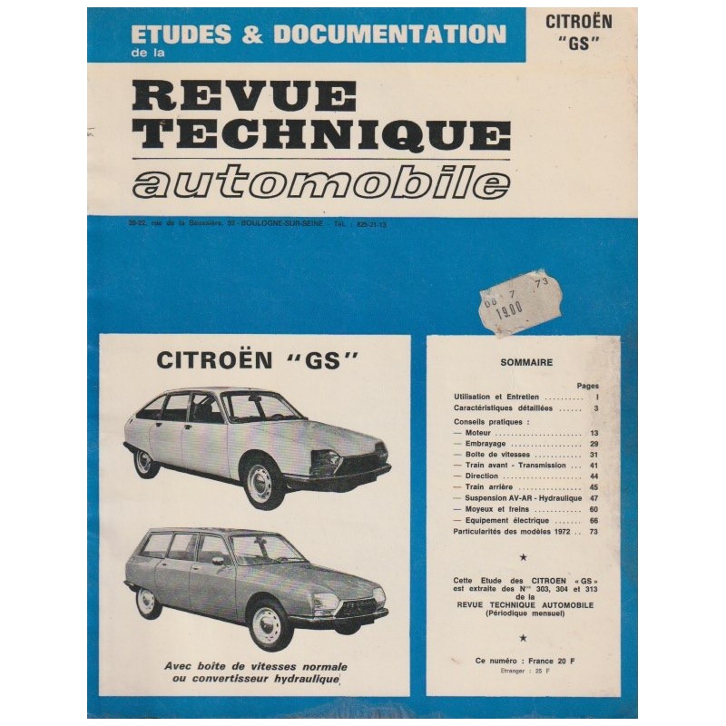 - RTA n° 303/304 Edition Aout 1971 Mecanique & Electricité Citroen GS 1015 cm3 BV Meca 4V & BV Convertiseur 3V 75 Pages Bon Etat