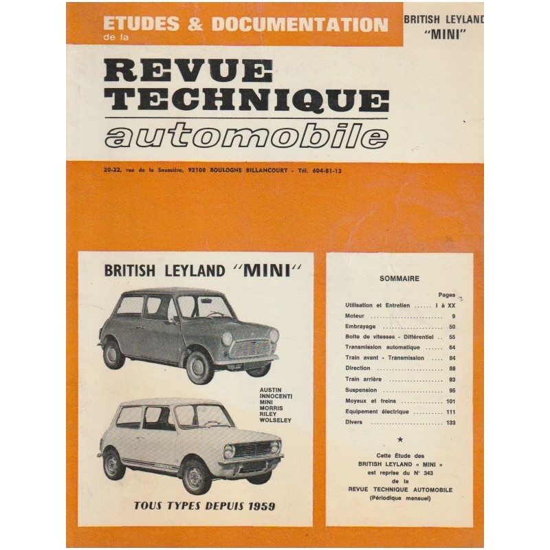 - Etude & Documentation Reprend les RTA N° 343 , 379 494 & 545 Edition 1994 Mecanique & Electricité Austin Mini & Mini Cooper Tous Types depuis 1959 a 1992 195 Pages