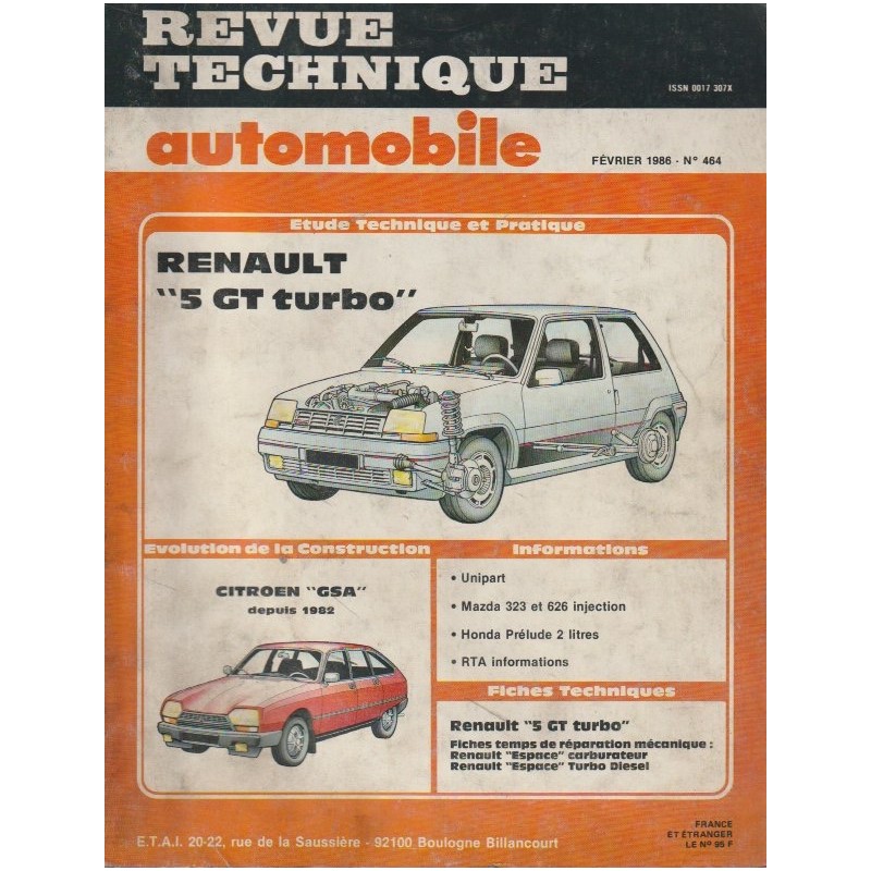 - MR 276   Renault 5 GT Turbo  Version Coupe : 1985 > 1988 - Moteur - Allumage - Schemas Electrique - Embrayage - Boite de Vitesses - Train AV / Train AR - Freinage 198 Pages Edition Janvier 1988 Reproduction