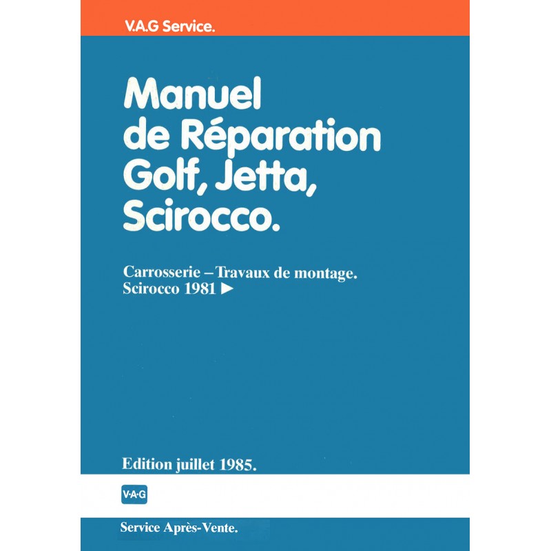 - Manuel de Reparation Moteur 1.8L Injection Scirocco 1981 > ...... - Caracteristiques - Depose & Pose - Equipage Mobile - Culasse - Graissage - Refroidissement - Alimentation - Carburation K-Jetronic - KE-Jetronic - Echappement - Allumage 172 Pages Edition Decembre 1987 Reproduction