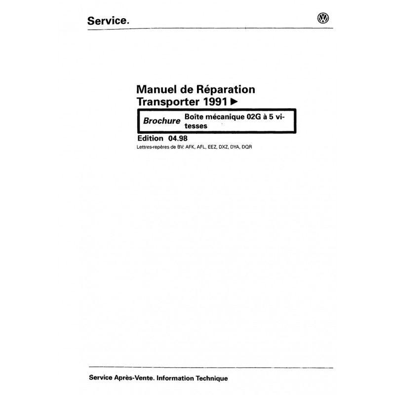 - Manuel de Reparation Boite de Vitesses Mecanique Type 02G Transmission Integrale - Caracteristiques - Embrayage - Commande - Carter de Boite - Pignons & Arbres - Transmission - Differentiel AV & AR Edition Avril 1998 220 Pages Reproduction