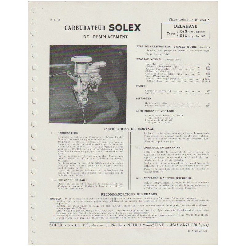 - Fiche Carburateur Solex Type 40 PAI 2 Pages Bon Etat