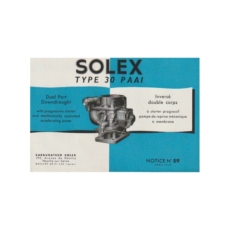 - Notice de Reglage N°60A Carburateur Solex 26 ZAKV & 30 AKV Reglages & Entretien Edition 09/1946 4 Pages Format 210 mm x 135 mm Bon Etat