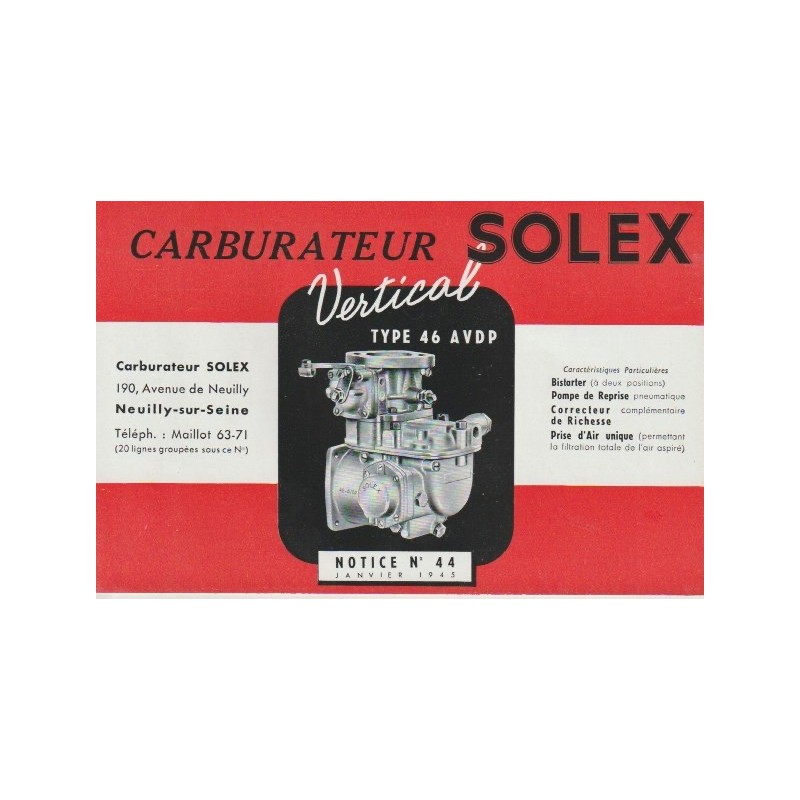 - Notice de Reglage N°60A Carburateur Solex 26 ZAKV & 30 AKV Reglages & Entretien Edition 09/1946 4 Pages Format 210 mm x 135 mm Bon Etat