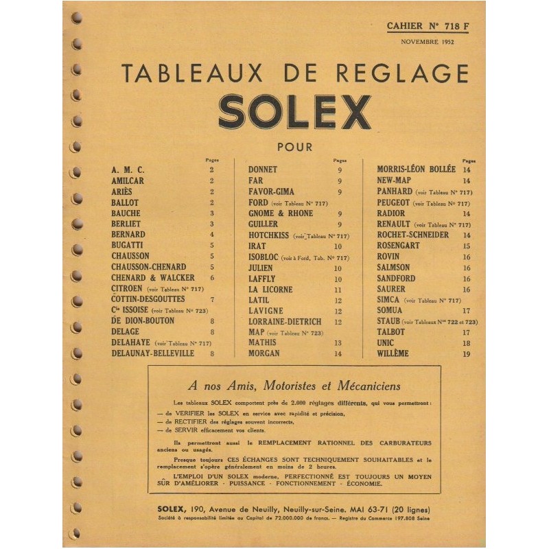 - Notice de Reglage N°719 C Carburateurs Solex Reglages & Montage Edition 10/1952 16 Pages Format 210 mm x 290 mm Bon Etat Couverture Legerement Usée !!