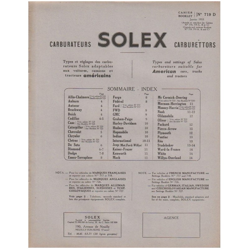 - Notice de Reglage N°719 C Carburateurs Solex Reglages & Montage Edition 10/1952 16 Pages Format 210 mm x 290 mm Bon Etat Couverture Legerement Usée !!