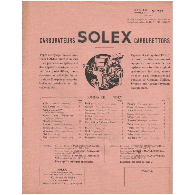 - Notice de Reglage N°727 G Carburateurs Solex Reglages & Montage Edition 09/1966 20 Pages Format 210 mm x 290 mm Bon Etat Couverture Legerement Usée !!