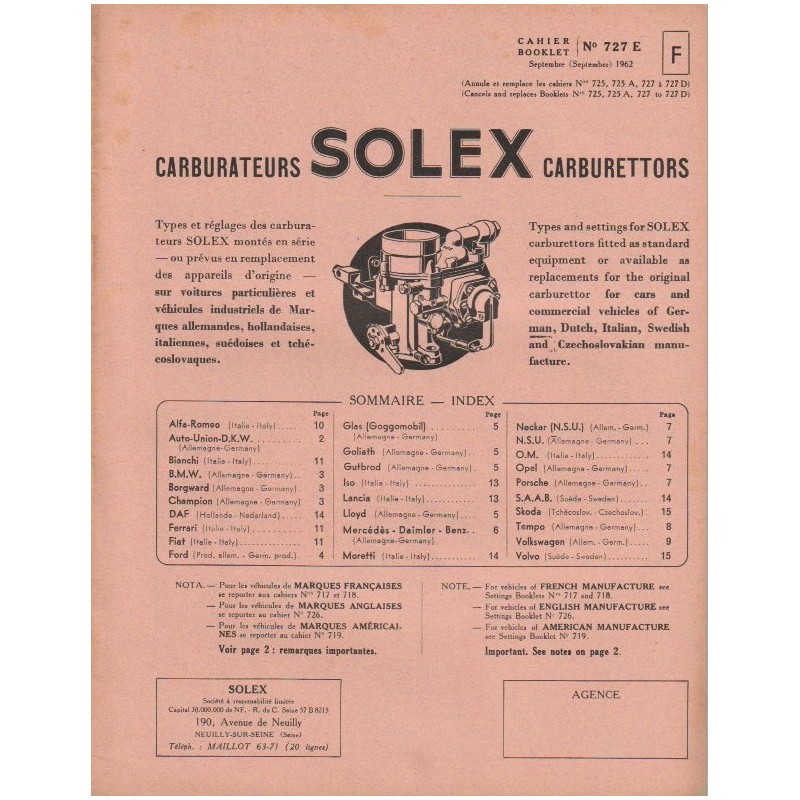 - Notice de Reglage N°727 B Carburateurs Solex Reglages & Montage Edition 07/1957 12 Pages Format 210 mm x 290 mm Bon Etat Couverture Legerement Usée !!