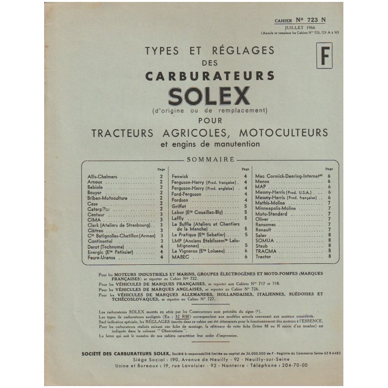 - Notice de Reglage N°727 G Carburateurs Solex Reglages & Montage Edition 09/1966 20 Pages Format 210 mm x 290 mm Bon Etat Couverture Legerement Usée !!