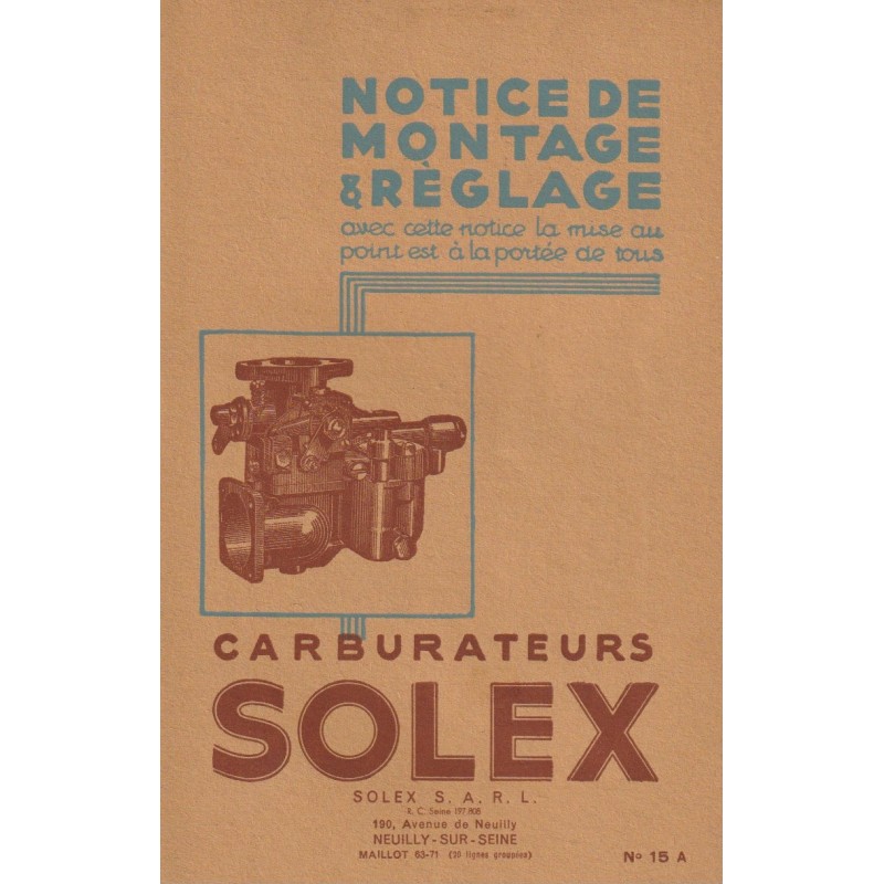 - Notice de Reglage Carburateurs Solex Types : Horizontaux , Verticaux Inversés , Double-Corps Instalation , Reglages & Entretien 32 Pages Edition 12/1937 Format 210 mm x 135 mm Bon Etat